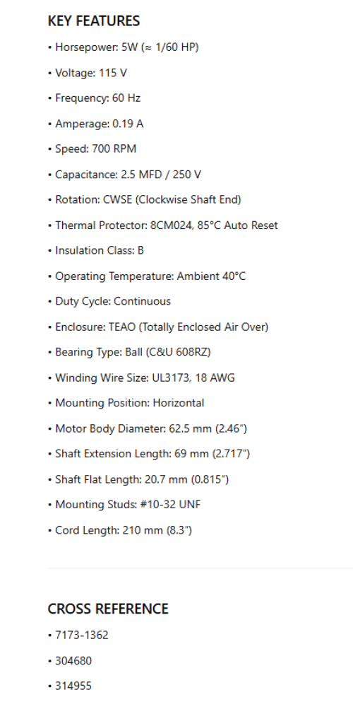 314955P, OEM Replacement, 1/60Hp, 700 RPM, 115V, TEAO, CWSE