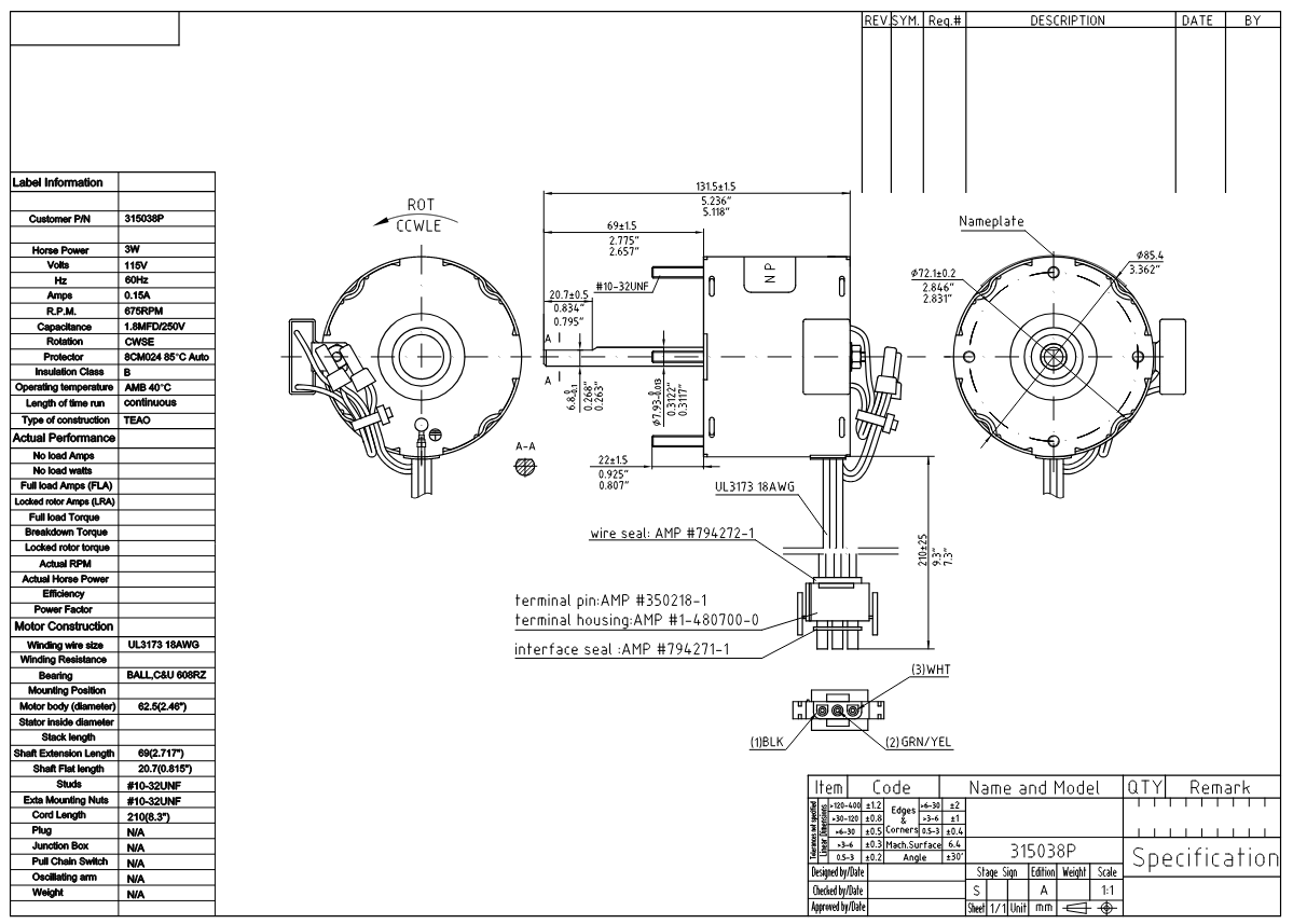 • Thermal Protector: 8CM024, 85°C Auto Reset