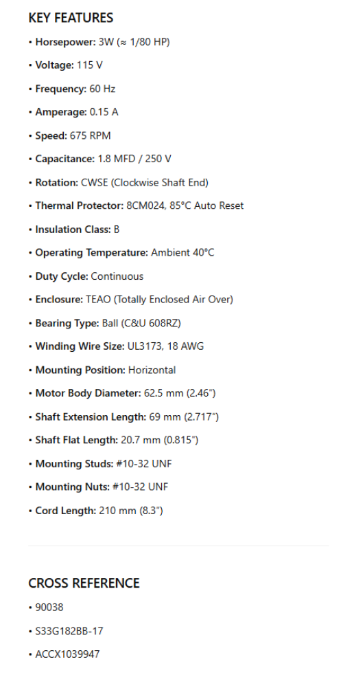 315038P, OEM Replacement, 1/80Hp, 675 RPM, 115V, TEAO, CWSE