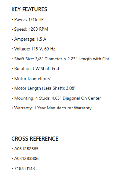 615056A, OEM Replacement, 1/16Hp, 1200 RPM, 115V, CWSE, 5″ Dia.