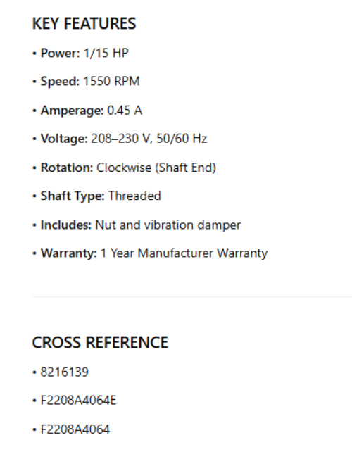8216139M, OEM Replacement, 1/15Hp, 1550 RPM, 208-230V, CWSE