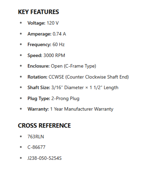 86677, OEM Replacement Motor, 120V, 3000 RPM, CCWSE, C FRAME