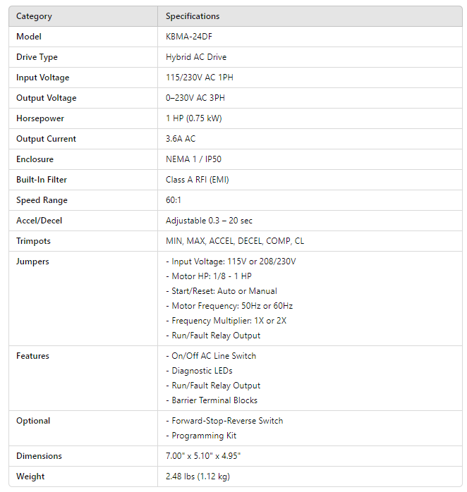 9534, (KBMA-24DF) Hybrid AC Drive 1Hp 3.6A 115/230V 1PH Input 230V 3PH Output NEMA 1 IP50 - Built-In Class A RFI AC Line Filter
