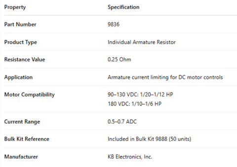 9836, INDIVIDUAL RESISTOR .25 Ohm ARMATURE 1/20-1/12Hp 90-130VDC ~ 1/10-1/6Hp 180VDC .5-.7ADC (BULK KIT 50x 9888) is backordered and will ship as soon as it is back in stock.