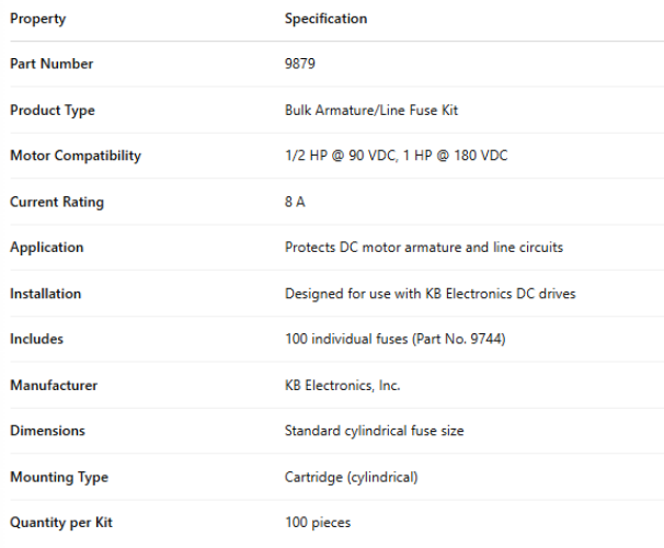 9879, BULK FUSE KIT (100PCS) 1/2HP 90VDC ~ 1HP 180VDC 8A (UNIT P/N 9744) is backordered and will ship as soon as it is back in stock.