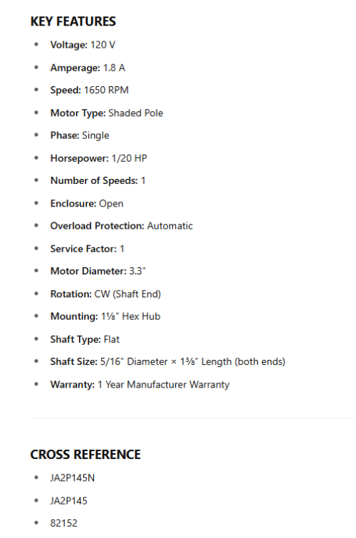 99-08-0152, OEM Replacement , 120V, 1650 RPM, 1/20Hp, CWSE, 3.3″ is backordered and will ship as soon as it is back in stock.