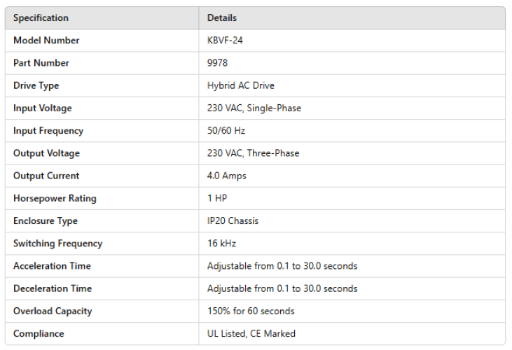 9978, (KBVF-24) Hybrid AC Drive 1Hp 4A 230V 1PH Input 230V 3PH output IP20 Chassis