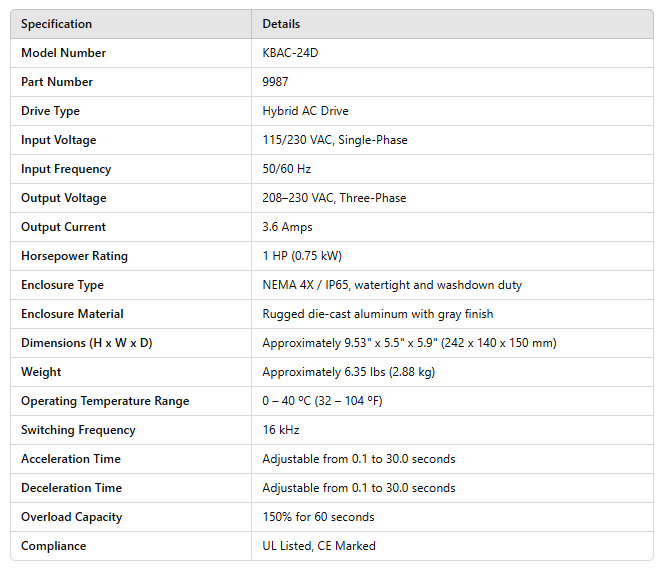 9987, (KBAC-24D) Hybrid AC Drive 1Hp 3.6A 115/230V 1PH Input 230V 3PH Output NEMA 4X Enclosure - Gray W/GFCI SOFTWARE