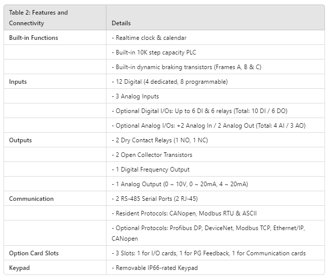Option Card Slots - 3 Slots: 1 for I/O cards, 1 for PG Feedback, 1 for Communication cards
