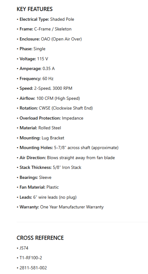 C574A, Universal Fireplace Blower Fan 2 Speed, 115 Volt, 3000 RPM, CWSE, OAO