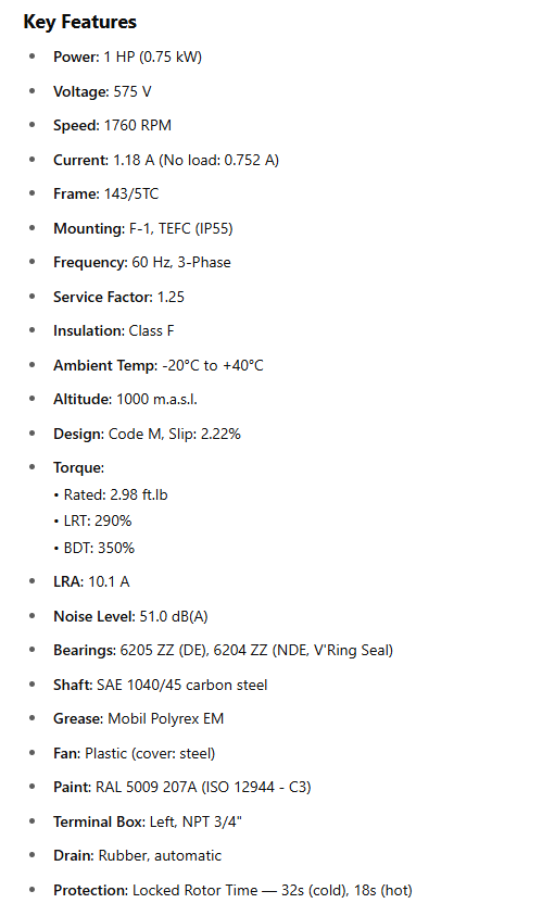 CT000504NPW22, W22 NEMA Premium Efficiency 1Hp 1760 RPM 4P 143/5TC 3Ph 575 V 60 Hz IC411 - TEFC - Foot-mounted
