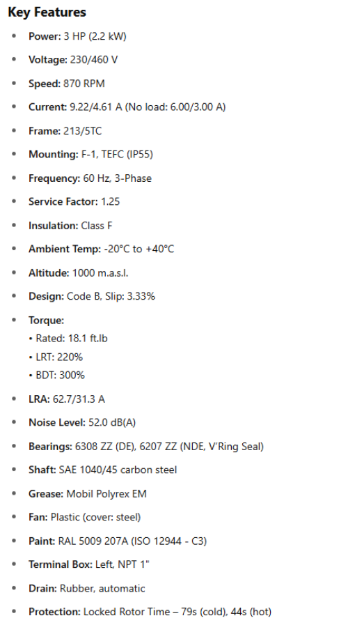• Bearings: 6308 ZZ (DE), 6207 ZZ (NDE, V’Ring Seal)