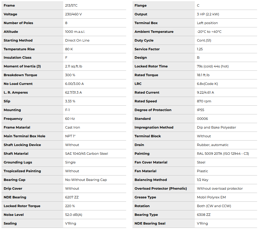 CT003408NPW22, W22 NEMA Premium Efficiency 3Hp 870 RPM 8P 213/5TC 3Ph 230/460//380 V 60//50 Hz IC411 - TEFC - Foot-mounted