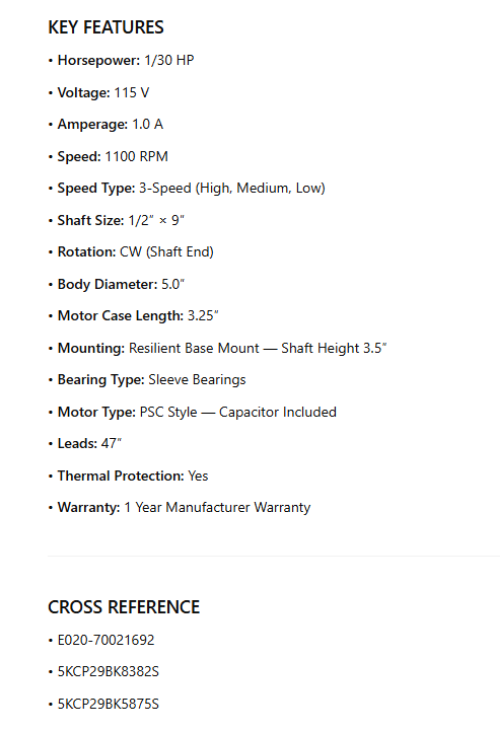 D1045P, OEM Replacement, 1/30Hp, 1100 RPM, 115V, CWSE, 5.0″ Dia. is backordered and will ship as soon as it is back in stock.
