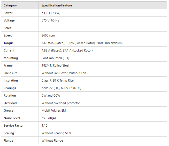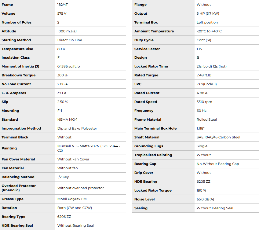 DP005502NPW01, Rolled Steel NEMA Premium Efficiency 5Hp 3510 Rpm 2P 182/4T 3Ph 575 V 60 Hz IC01 - ODP - Foot-mounted