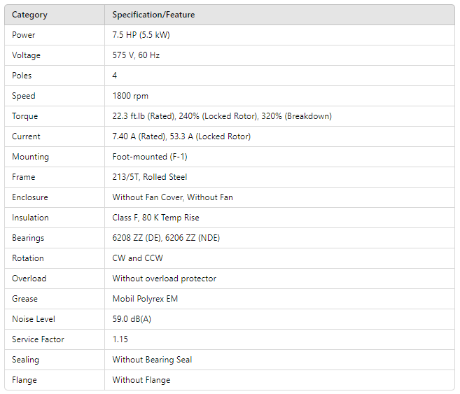 DP007504NPW01, Rolled Steel NEMA Premium Efficiency 7.5Hp 1770 Rpm 4P 213/5T 3Ph 575 V 60 Hz IC01 - ODP - Foot-mounted