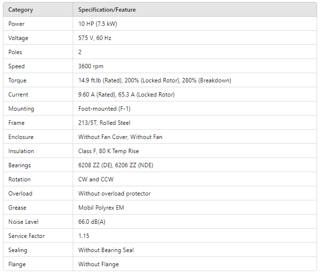 Torque 14.9 ft.lb (Rated), 200% (Locked Rotor), 280% (Breakdown)