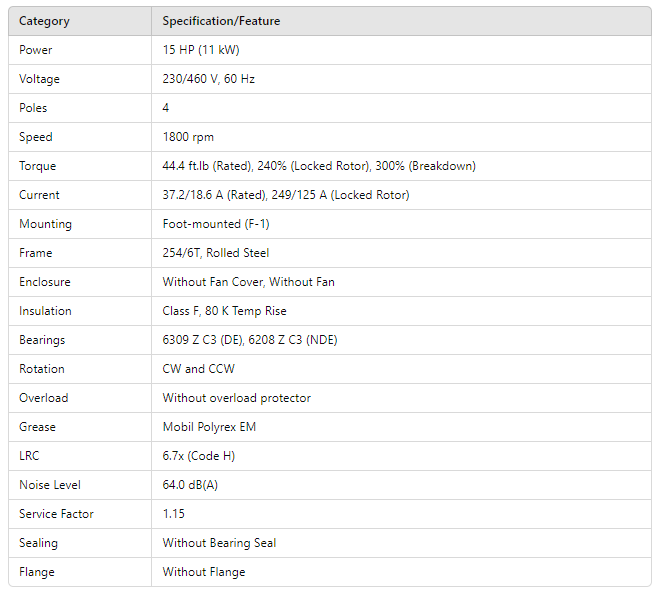 DP015404NPW01, Rolled Steel NEMA Premium Efficiency 15Hp 1775 Rpm 4P 254/6T 3Ph 230/460//190-220/380-415 V 60 Hz IC01 - ODP - Foot-mounted is backordered and will ship as soon as it is back in stock.
