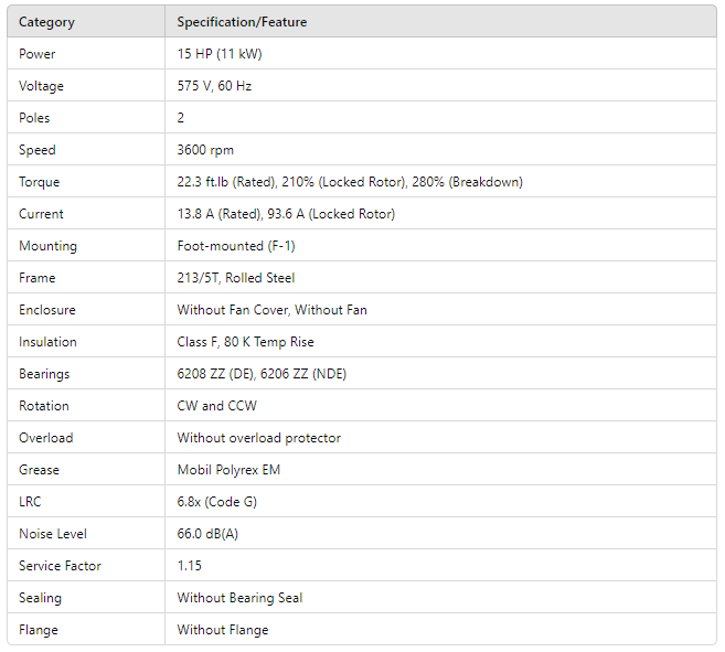 Torque 22.3 ft.lb (Rated), 210% (Locked Rotor), 280% (Breakdown)