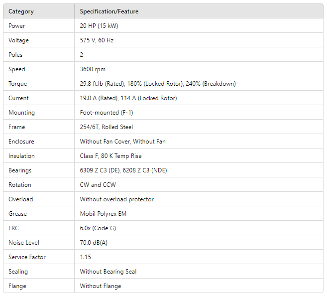 Torque 29.8 ft.lb (Rated), 180% (Locked Rotor), 240% (Breakdown)