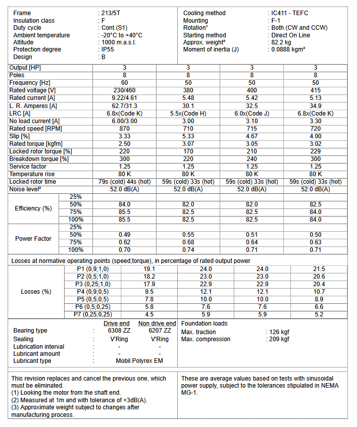 • Bearings: 6308 ZZ (DE), 6207 ZZ (NDE), V'Ring Seal