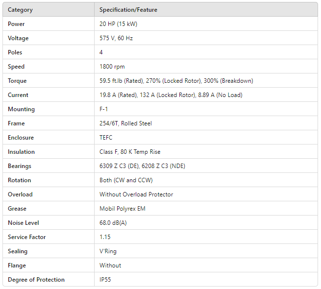 Torque 59.5 ft.lb (Rated), 270% (Locked Rotor), 300% (Breakdown)