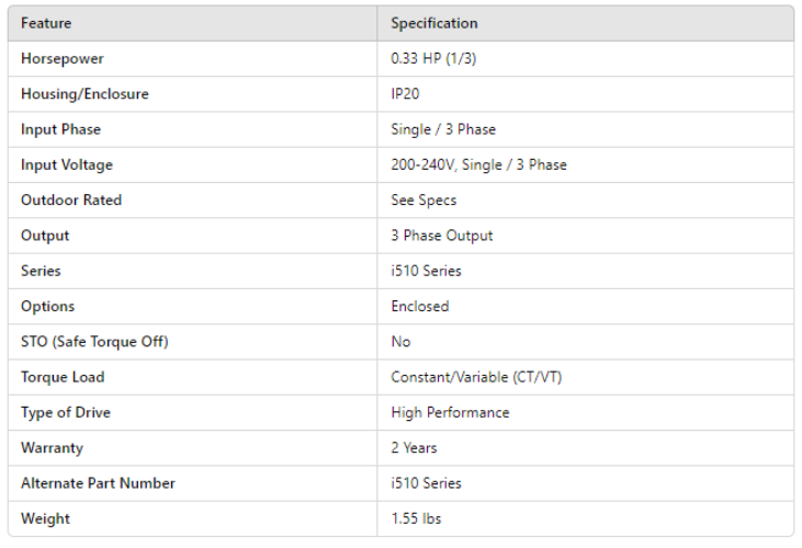 I51AE125D10V01000S, i510-C INVERTER 0.33Hp 1/3PH(i/p) 230V / 230V 3PH(o/p) / 1.7A (o/p) / 0-599HZ(o/p) / BASIC IO / IP20