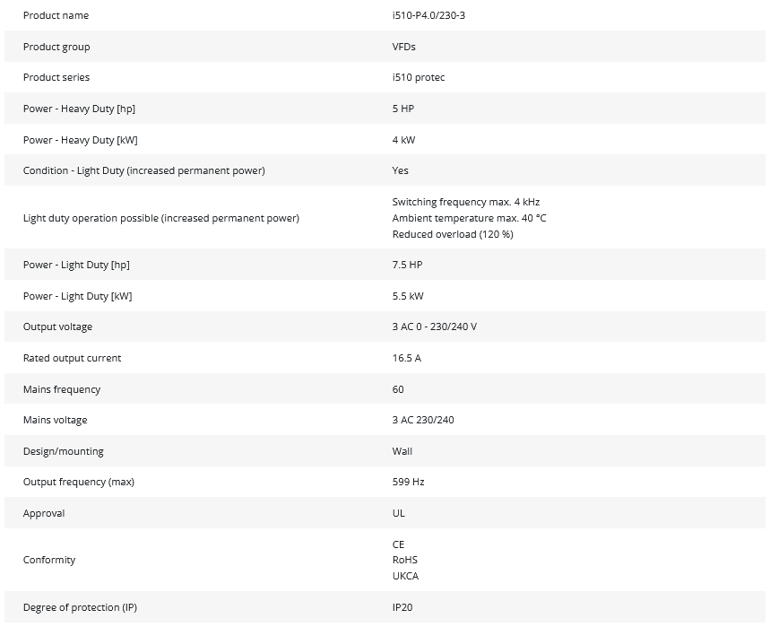Robust and trusted, the i510 protec variable frequency drive (VFD) is purpose-built to be mounted outside the control cabinet or close to the motor. A focus on low cost and simple functionality in the power range of 0.5 to 15 hp (0.37 to 11 kW), makes this reliable drive the right solution in various applications.