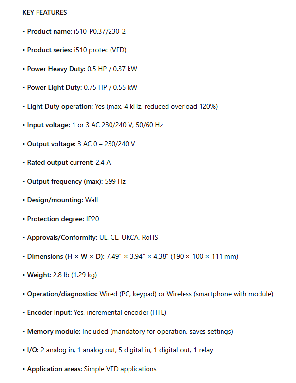 I51BP137D00001K00S, i510 PROTEC, NEMA 1 / IP20, 0.37 kW, 0.50Hp, 1/3ph 230V, Standard I/O, no safety technology, no extension box, LCD keypad module is backordered and will ship as soon as it is back in stock.