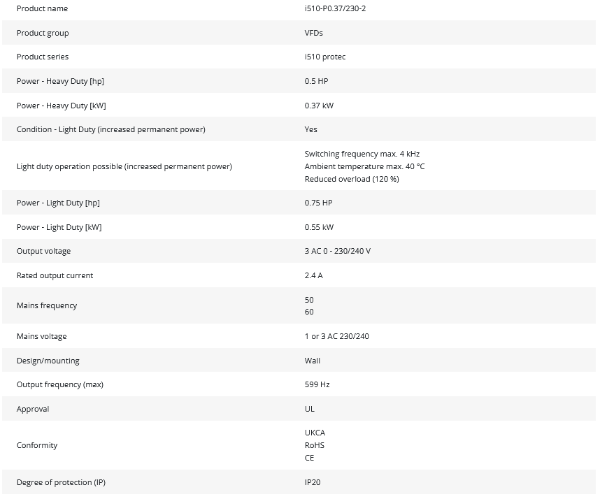 Robust and trusted, the i510 protec variable frequency drive (VFD) is purpose-built to be mounted outside the control cabinet or close to the motor. A focus on low cost and simple functionality in the power range of 0.5 to 15 hp (0.37 to 11 kW), makes this reliable drive the right solution in various applications.