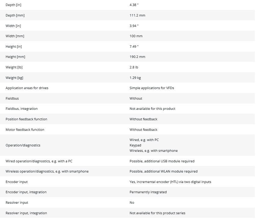 • Light Duty operation: Yes (max. 4 kHz, reduced overload 120%, ambient temp. 40 °C)