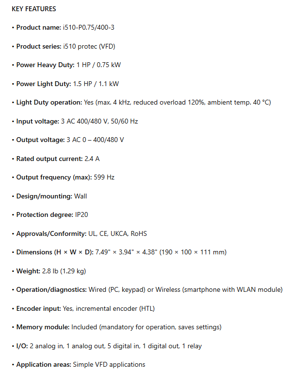 I51BP175F00001K00S, i510 PROTEC, NEMA 1 / IP20, 0.75 kW, 1.0Hp, 3ph 400/480V, Standard I/O, no safety technology, no extension box, LCD keypad module is backordered and will ship as soon as it is back in stock.