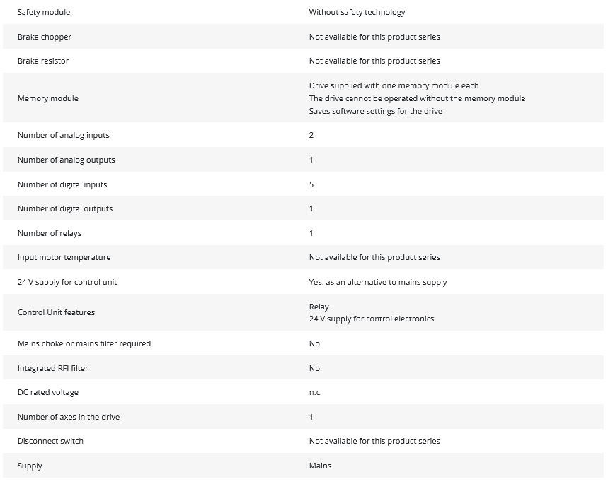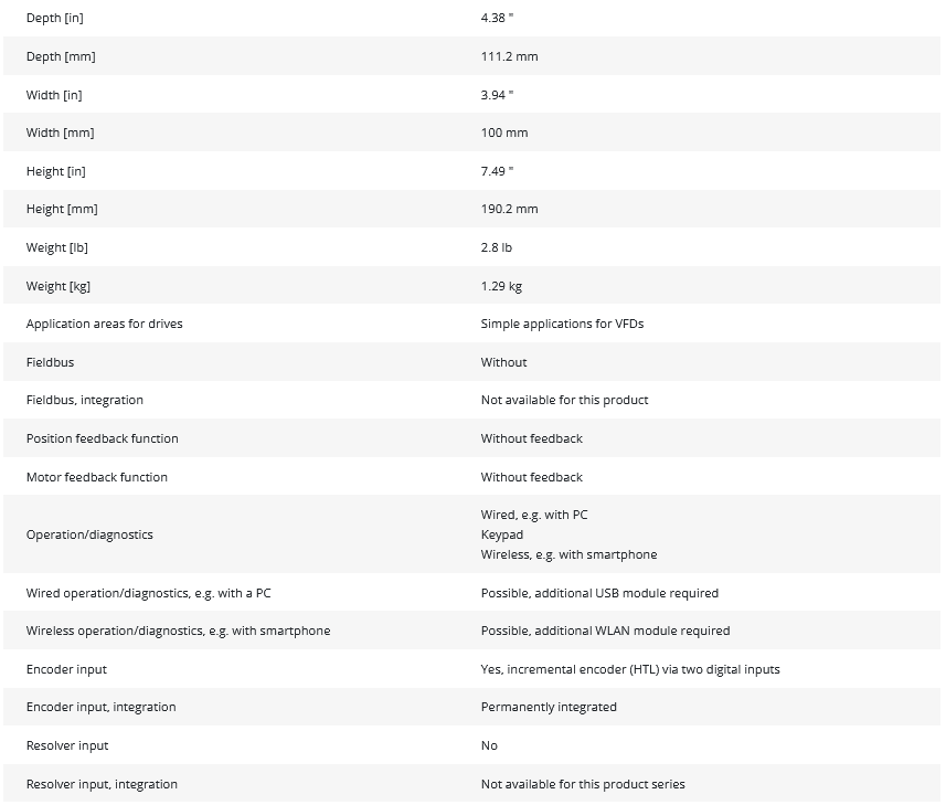 • Light Duty operation: Yes (max. 4 kHz, reduced overload 120%, ambient temp. 40 °C)