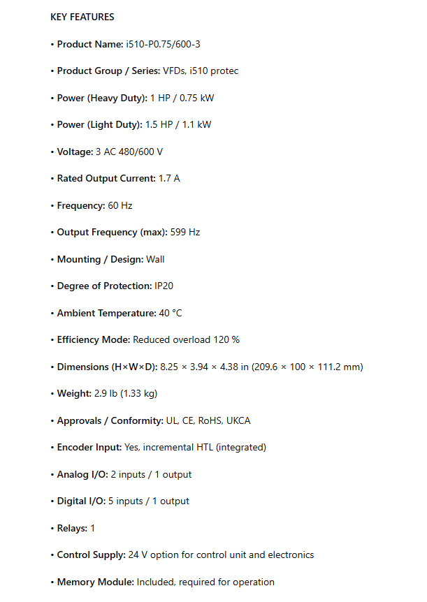 I51BP175G00001K00S, i510 PROTEC, NEMA 1 / IP20, 0.75 kW, 1.0Hp, 3ph 480/600V, Standard I/O, no safety technology, no extension box, LCD keypad module is backordered and will ship as soon as it is back in stock.