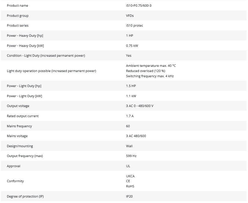 Robust and trusted, the i510 protec variable frequency drive (VFD) is purpose-built to be mounted outside the control cabinet or close to the motor. A focus on low cost and simple functionality in the power range of 0.5 to 15 hp (0.37 to 11 kW), makes this reliable drive the right solution in various applications.