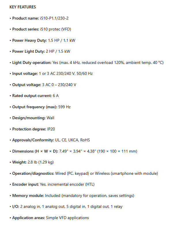 I51BP211D00001K00S, i510 PROTEC, NEMA 1 / IP20, 1.1 kW, 1.5Hp, 1/3ph 230V, Standard I/O, no safety technology, no extension box, LCD keypad module is backordered and will ship as soon as it is back in stock.