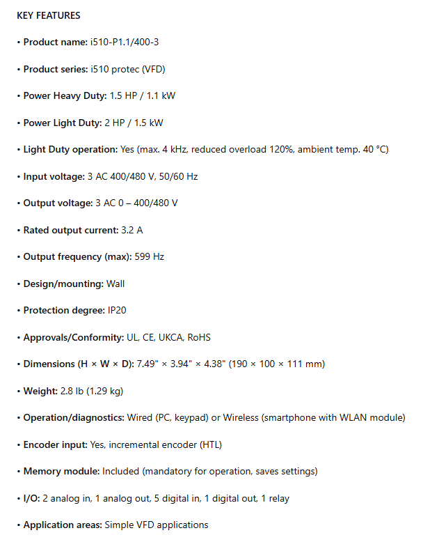 I51BP211F00001K00S, i510 PROTEC, NEMA 1 / IP20, 1.1 kW, 1.5Hp, 3ph 400/480V, Standard I/O, no safety technology, no extension box, LCD keypad module