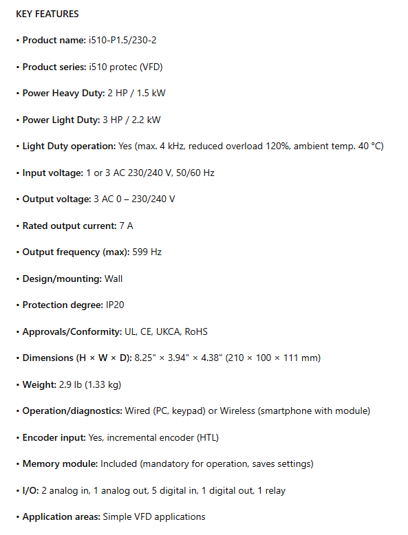 I51BP215D00001K00S, i510 PROTEC, NEMA 1 / IP20, 1.5 kW, 2.0Hp, 1/3ph 230V, Standard I/O, no safety technology, no extension box, LCD keypad module is backordered and will ship as soon as it is back in stock.