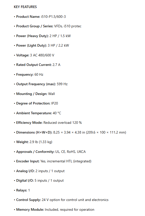 I51BP215G00001K00S, i510 protec, NEMA 1 / IP20, 1.5 kW, 2Hp, 3ph 480/600V, Standard I/O, no safety technology, no extension box, LCD Keypad
