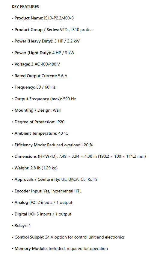 I51BP222F00001K00S, i510 PROTEC, NEMA 1 / IP20, 2.2 kW, 3.0Hp, 3ph 400/480V, Standard I/O, no safety technology, no extension box, LCD keypad module