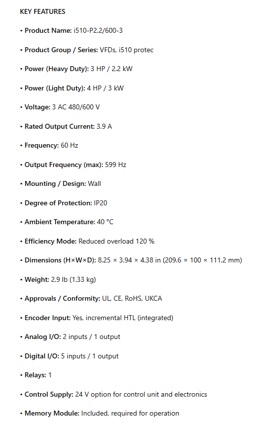 I51BP222G00001K00S, i510 protec, NEMA 1 / IP20, 2.2kW, 3Hp, 3ph 480/600V, Standard I/O, no safety technology, no extension box, LCD Keypad