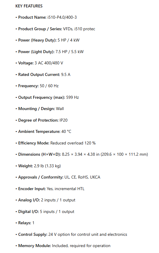 I51BP240F00001K00S, i510 PROTEC, NEMA 1 / IP20, 4.0 kW, 5.0Hp, 3ph 400/480V, Standard I/O, no safety technology, no extension box, LCD keypad module