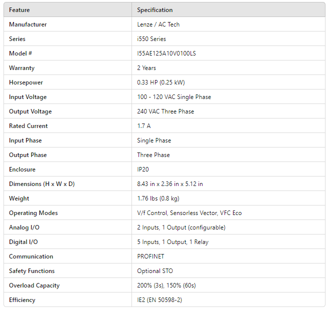 I55AE125A10V0100LS, i550-C INVERTER 0.33Hp 1PH(i/p) 120V / 230V 3PH(o/p) / 1.7A (o/p) / 0-599HZ(o/p) / STANDARD IO / PROFINET / IP20