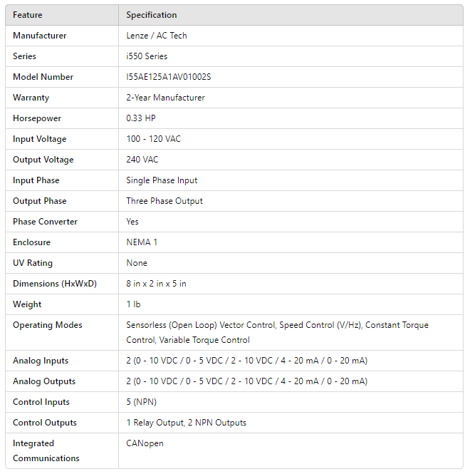 I55AE125A1AV01002S, i550-C INVERTER 0.33Hp 1PH(i/p) 120V / 230V 3PH(o/p) / 1.7A (o/p) / 0-599HZ(o/p) / STANDARD IO / CANOPEN / STO / IP20