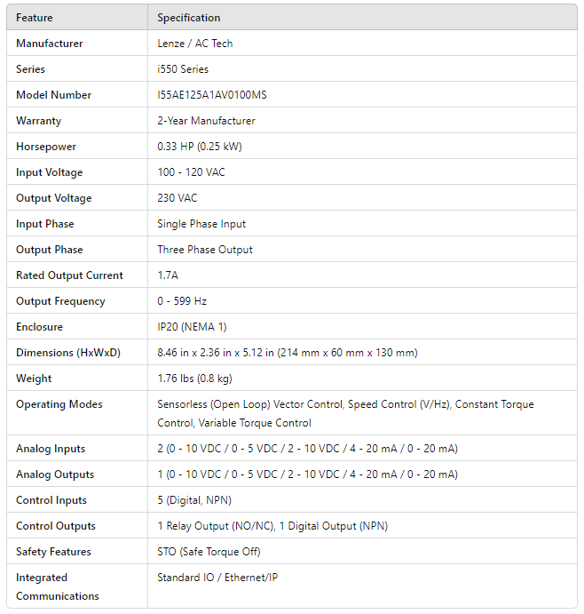 I55AE125A1AV0100MS, i550-C INVERTER 0.33Hp 1PH(i/p) 120V / 230V 3PH(o/p) / 1.7A (o/p) / 0-599HZ(o/p) / STANDARD IO / ETHERNET/IP / STO IP20