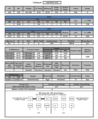 IJA2100L2-4-24, 4Hp 1740RPM 208-230/460/3/60-50 TEFC 100L ALUMINUM IE3 10:1 CT~20:1 VT IP55 CLASS H 1.15SF (156mm O.D.)