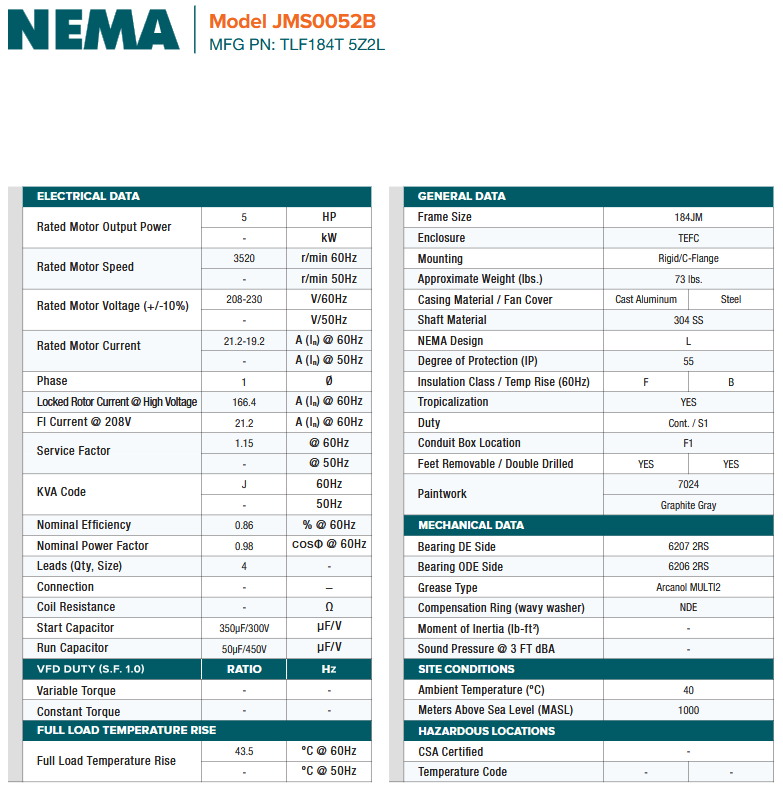 JMS0052B, 5Hp 3600RPM 208-230V 60HZ 184JM TEFC 1PH Alum Close Coupled Pump Motor is backordered and will ship as soon as it is back in stock.
