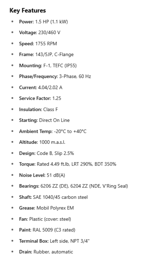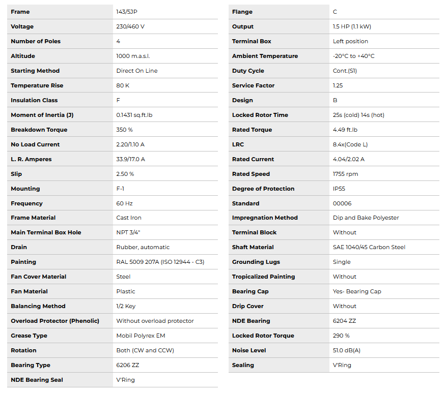 • Torque: Rated 4.49 ft.lb, LRT 290%, BDT 350%