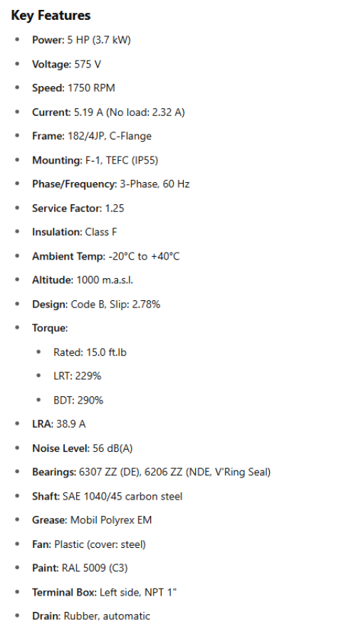 • Bearings: 6307 ZZ (DE), 6206 ZZ (NDE, V'Ring Seal)