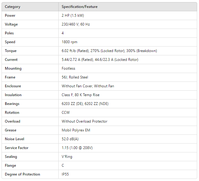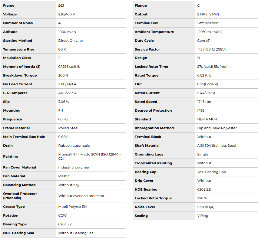Torque 6.02 ft.lb (Rated), 270% (Locked Rotor), 300% (Breakdown)